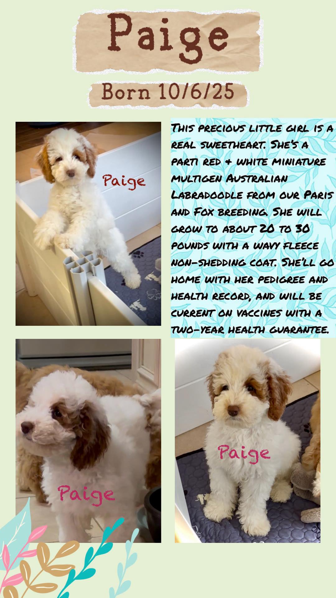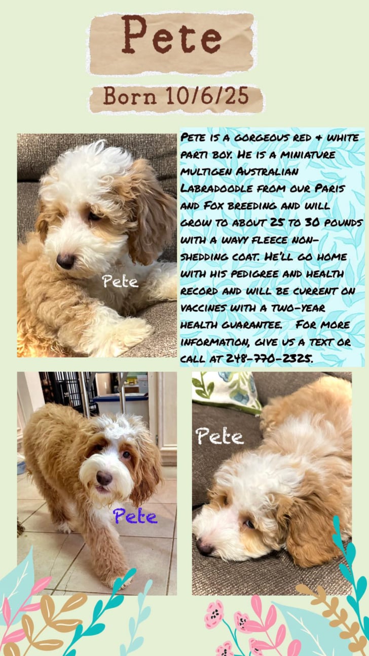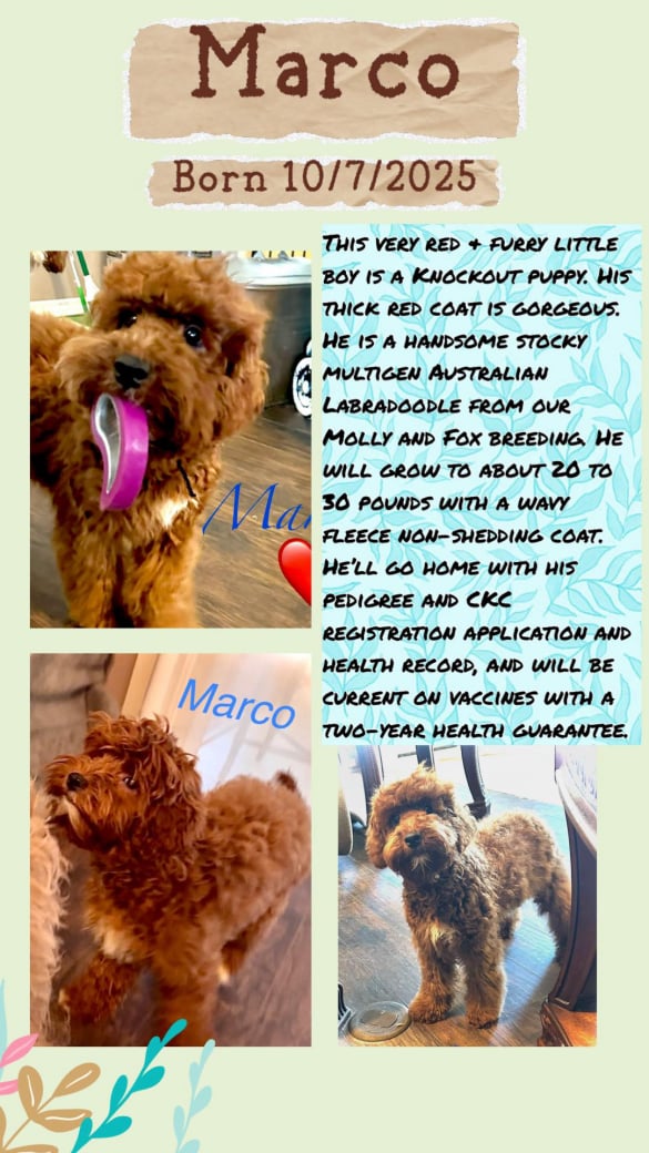Born on October 6th and October 7th, Paris and Maddie had their most recent litters. We have red and parti colors with wavy fleece coats. All pups will be between 20-30 lbs and available to go home.